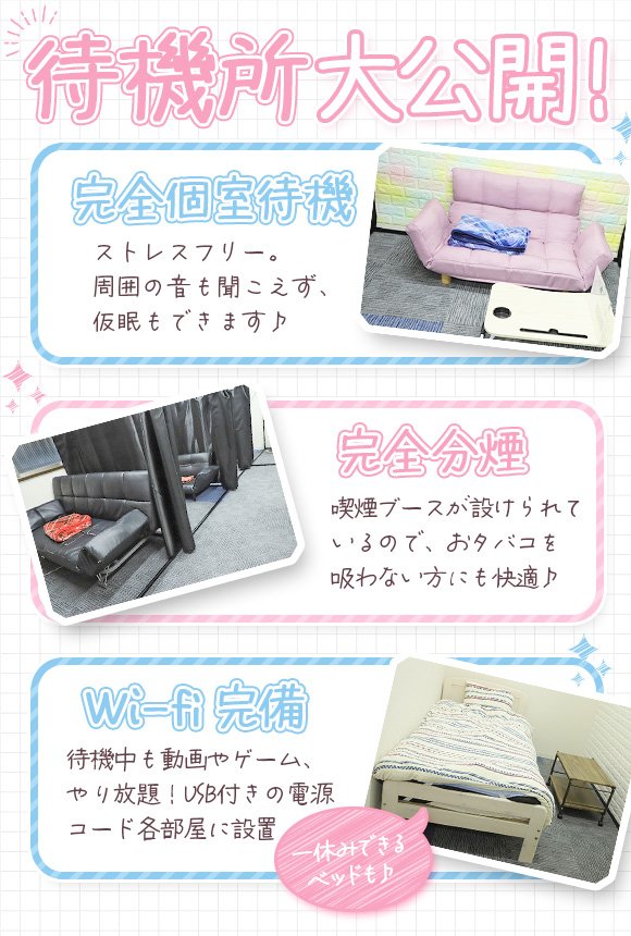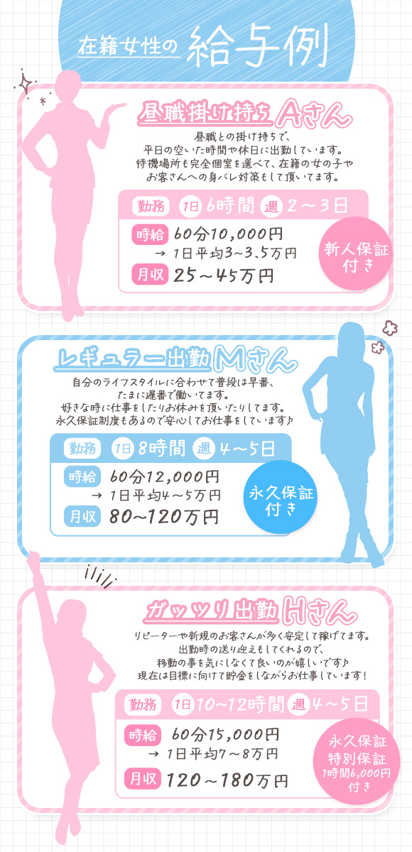 副業やWワークを歓迎しているお店だよ。時間が許す限りガンガン働いていお金を稼ぎたい女の子にはありがたいよね。シフトの入れ方にはお店ごとに決まりがあるから、詳しい条件は問い合わせてみよう♪