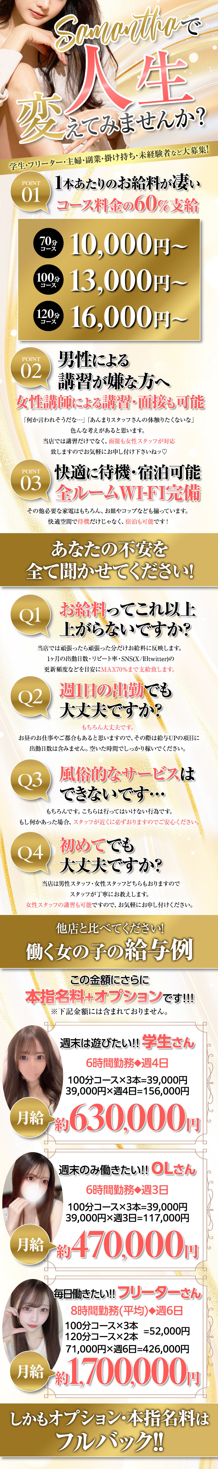 副業やWワークを歓迎しているお店だよ。時間が許す限りガンガン働いていお金を稼ぎたい女の子にはありがたいよね。シフトの入れ方にはお店ごとに決まりがあるから、詳しい条件は問い合わせてみよう♪