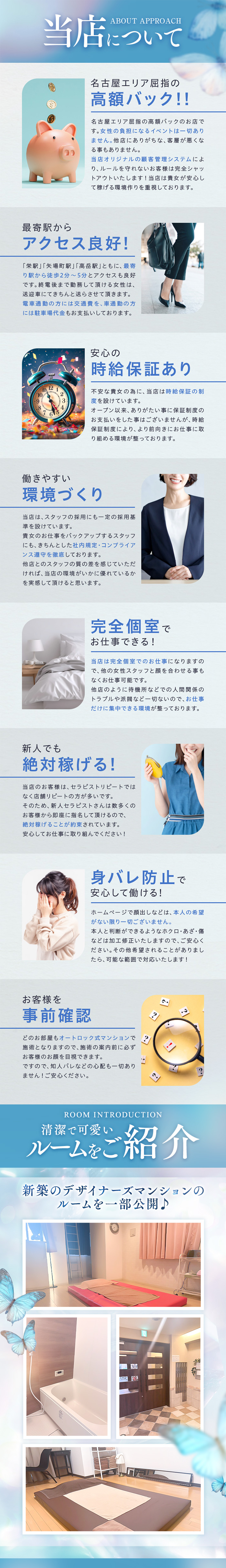 子持ちのママさんでも安心して働けるように、託児所を紹介できるお店だよ!最近はお店が提携してくれている託児所も多いんだって!お店によっては託児所の費用を一部負担してくれるみたいだから、必要な時は詳しく聞いてみてね☆