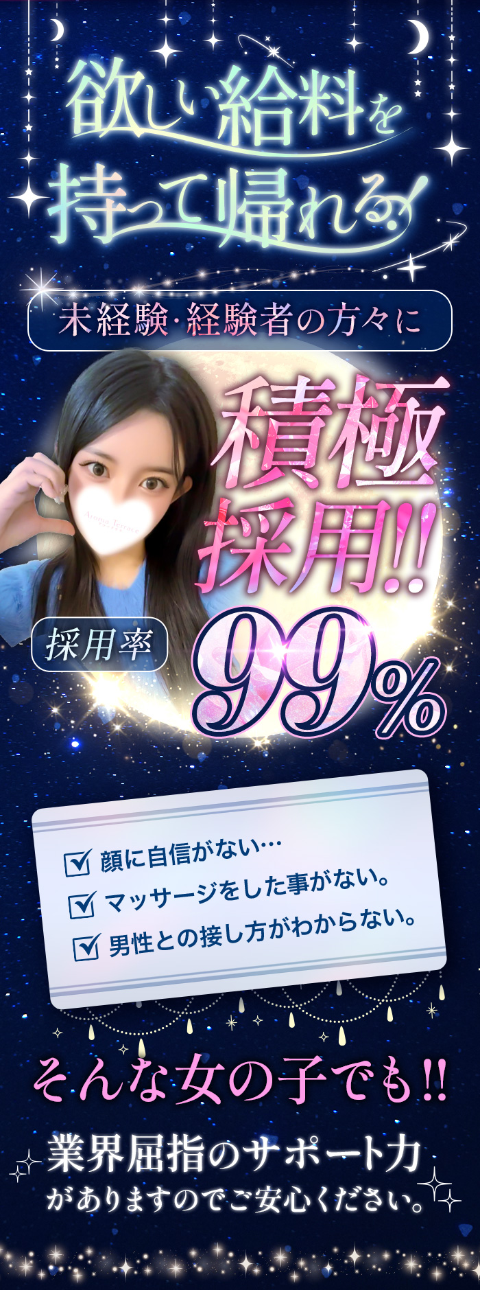 Q.もしお客さまが来なかったら、お給料はどうなりますか?ほとんどありませんが、万が一その日がお仕事なしでも待機していた時間分のお給料はお支払いしています。「出勤したのに何ももらえない」ことはありませんので安心してくださいね。――――――――――――――Q.終電がなくなったらどうなりますか?遅い時間になってしまった場合も、スタッフが対応しますので心配いりません。その都度ご相談ください。――――――――――――――Q.どれくらい稼げますか?出勤時間やペースにもよりますが、6〜7時間ほどで15,000円〜30,000円くらいの方が多いです。無理のない働き方で大丈夫です。――――――――――――――Q.本当に未経験でも大丈夫ですか?もちろん大丈夫です。ほとんどの方が未経験からのスタートです。分からないことは、その都度スタッフがそばで教えますので一人で悩むことはありません。――――――――――――――Q.面接のときに必要なものはありますか?特別な準備は何もいりません。「ちょっと気になるな」という気持ちとリラックスした気持ちで来てくださいね。――――――――――――――「聞くだけでも大丈夫かな?」もちろん大丈夫です。気軽にお問い合わせください。