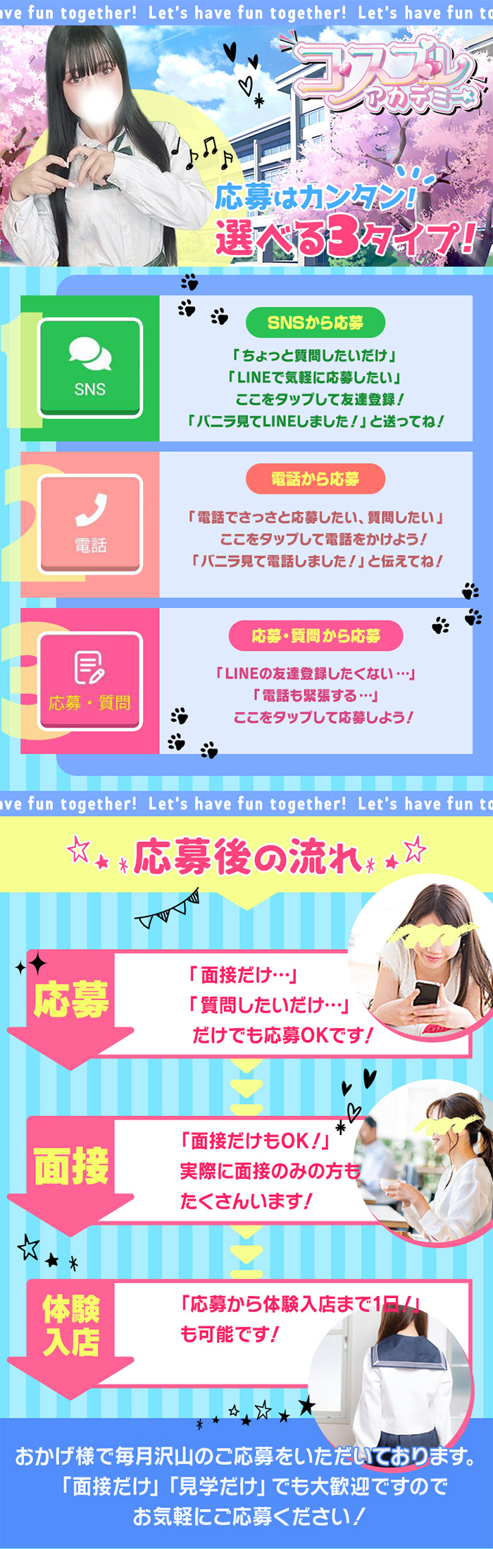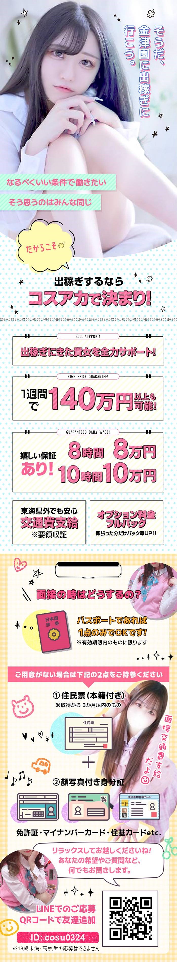 経験者、未経験者も大歓迎です☆ 金津園唯一の学園系で沢山稼ぎませんか? 【バニラからの応募特典】 ♥体験入店保証10万円など その他様々な特典がついてきます! 確実に稼いていただけますので、 一度面接だけでもお越しください(*^-^*) |