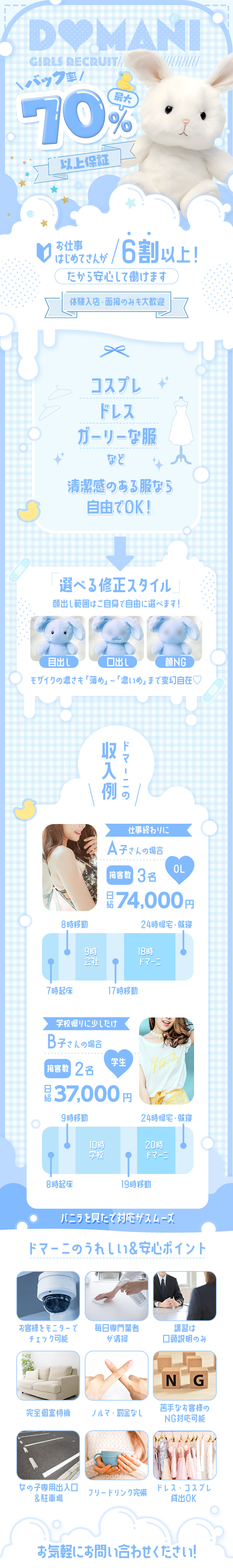 当店で働くお姫様やこれからドマーニで働いてくれるお姫様の為に…★バック料金大幅UP★以前、3日で20万円稼げると、うたっておりましたが、、、今なら2日で20万円以上稼いでる女の子もいます!体験入店も受付中ですので、是非一度お問い合わせ下さい♪