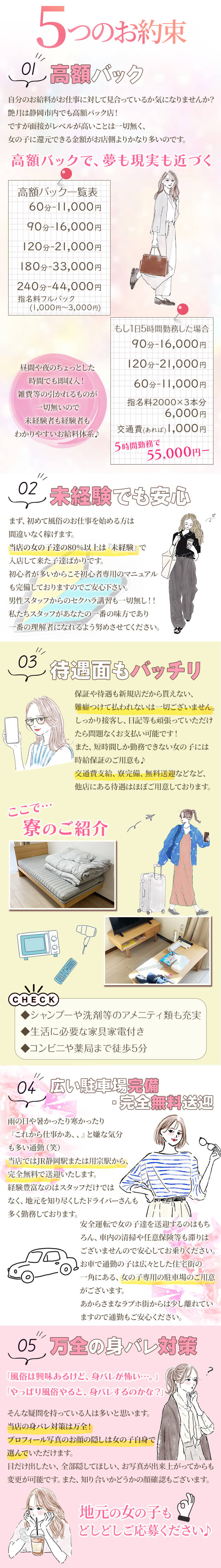 当店では身バレ対策を徹底しております。 お客様が見る集客ページでは、目出し、全隠し等、お写真の隠しは面接時に選べますのでご安心ください。 また派遣NGエリアの設定や自宅NGなど自分にあった働き方ができます。 お知り合いの方のお電話番号の事前登録等、顧客管理システムを使用しての運営となりますので、何なりとご相談ください。