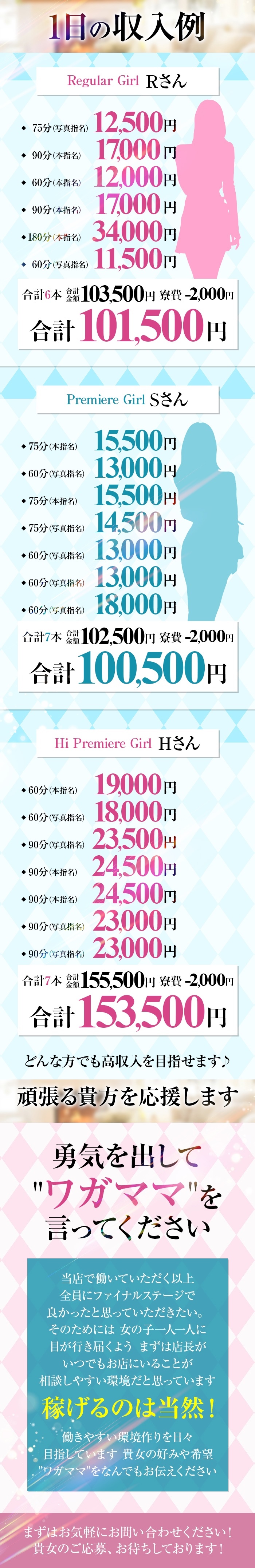 入店日 2024/04/22 勤務時間 1日6~12時間 月収 60万円以上 目標 沢山お金が欲しいです! 入店日 2024/01/15 勤務時間 1日6~8時間 初日の給与 6時間勤務で
