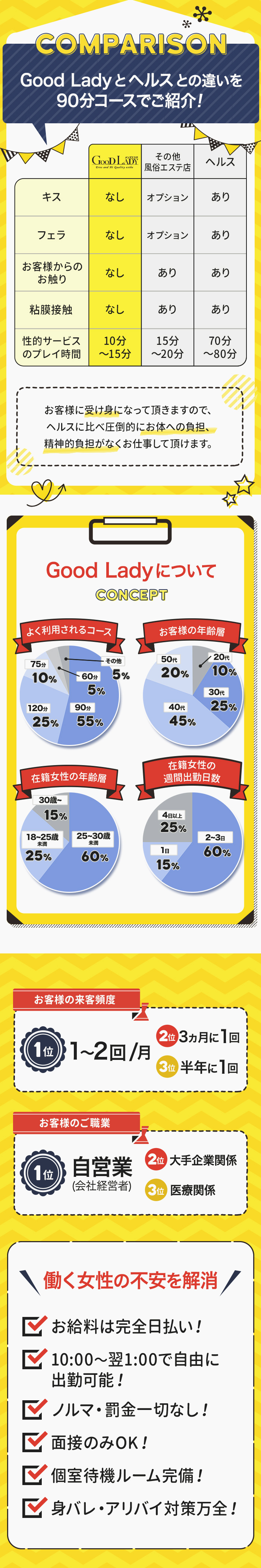 手を使うだけ・見ているだけ・または女の子が受け身にならなくてOKなソフトサービスメインのお店だよ♪初心者の女の子には始めやすいお仕事だね!コースによってサービスの違いがあるお店もあるみたいだから、お仕事内容は事前に聞いてみよう!