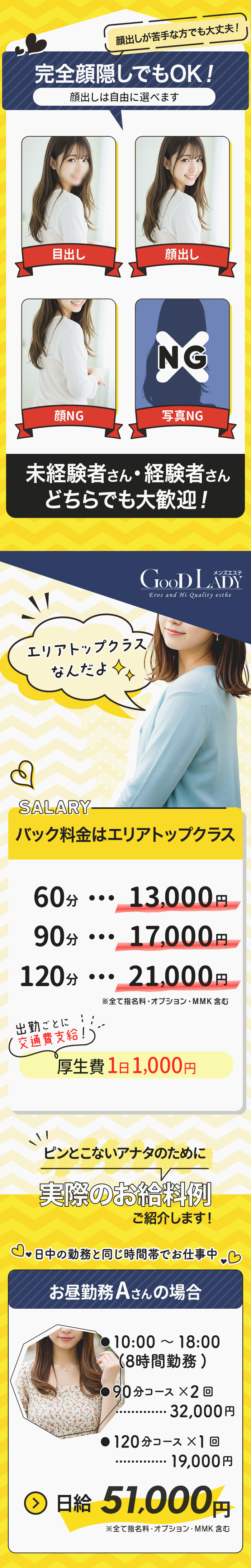 当店は女の子ファーストを徹底しています。 まずはLINEなどで納得いくまで質問するのがいいと思います。 返信内容や返信までの時間でお店の対応がよくわかると思います。 業界でありがちな厚生費、雑費といった名目の引かれものが一切ありません。 出勤毎に交通費を支給しています。 女性講師による無料講習は、何度でも受けられます。 当店では、外見よりも内面重視の接客的採用しています。