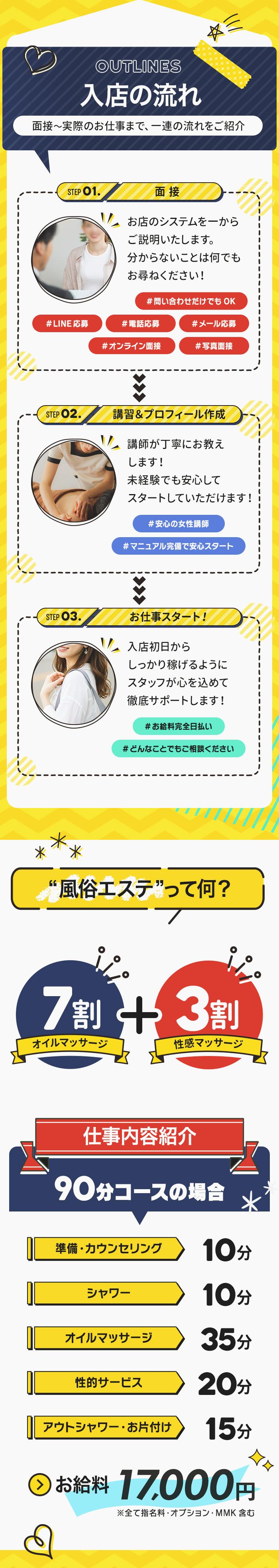 当店の種別は「メンズエステ」となります。風俗サービスとしては、「手コキ」によるハンドフィニッシュがサービス内容です。オプションでもヘルスサービスは行っていません。(お客様からのお触りはありません)(風俗エステはお店によってルールが異なります。)例 上半身OK下半身NG例 全身ソフトタッチOK終始お客様が受け身になって頂いて、女の子からのサービスを受けて頂くシステムです。ここからが「詳しく」の内容になりますが、実際のご案内の様子をざっと説明致しますね。お客様とご挨拶~お代金を頂いて、脱衣のお手伝い→バスルームへ誘導します。バスルームでお客様の体を洗います。ベッドで指圧等を行い、オイルマッサージを始めます。※具体的なマッサージの内容は、 女性相手の一般エステの手技とほぼ同じです。マッサージが終わったら、仰向けの姿勢をとってもらい、ハンドサービスによる性感マッサージでフィニッシュとなります。そのあとシャワーサービスを行ってコース終了、という感じです。コース時間も60分~2時間以上のロングまでありますので、コース時間によって施術範囲等、若干内容に差が出てきます。風俗業の中ではかなり衛生的に優れ、女の子が受け身になる事も無いので安全で、初めてナイトワークを始める方にもオススメの業種となっています。ちなみにお給料的には一昔前だとヘルスやソープに比べ、エステは稼げないイメージがありましたが、最近ではほぼ変わらないか、フルバック(全額支給)のオプションも多い事から、ヘルス店よりも稼げる場合も少なくありません。どうしてもマッサージの手技など、覚えなくてはならない事も多くはなりますが、風俗のお仕事では珍しく、お客様から本気で感謝される事も多く、収入面以外にも色々と、やりがいを感じて頂きやすいお仕事だと思います。もし少しでも興味を持って頂けましたら、お気軽にお問合せ下さいませ(*^-^*)