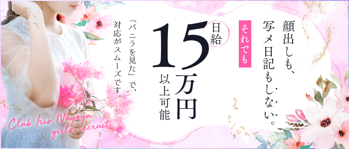 当店をご利用頂くお客様は、時間と経済的に余裕のある方が多く、ロングコースをゆったり満喫される方ばかり。特別なテクニックよりも「癒し」「落ち着き」が求められます。女性持ち前の色気や包容さえあれば、未経験からスタートされた女性でも、初日からしっかり稼いで頂ける環境となっております。当店のお給料は、ランクにより変動致します。基本的にご入店時は皆さんが同一ランクからのスタートとなります。1件90minSweetランク 最低24,000円~32,000円1件120minSweetランク最低32,000円~47,000円1件150minSweetランク最低42,000円~56,000円1件180minSweetランク最低48,000円~64,000円1件90minPresidentialランク最低32,000円~47,000円1件120minPresidentialランク最低40,000円~58,000円1件150minPresidentialランク最低52,000円~76,000円1件180minPresidentialランク最低60,000円~87,000円お仕事一本あたり、入店時からこちらのお給料は確定です。本指名をたくさん頂いてランクが上がれば、お仕事一本で10万円以上も可能です。当店にはあなたの夢や目標をより早く達成できる環境があります。スタッフが口頭にて一から丁寧にご説明させて頂きますので、ご不明な点がございましたら遠慮なくご質問下さいませ。あなた様のご応募お待ちしております。クラブアイリス名古屋TEL052-325-3778MAIL:iris-nagoya@vipclub-iris.com求人LINEID:iris-nagoya求人LINEURL http://line.me/ti/p/EJWYIvryN4