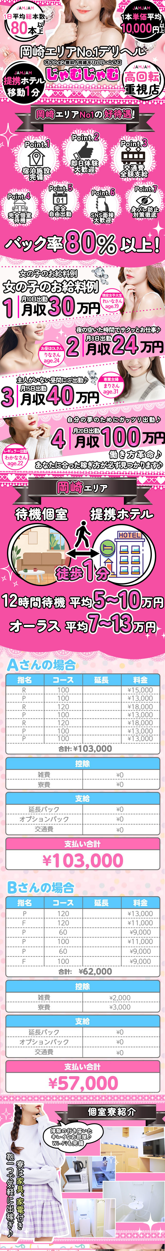 ✨片番平均5万~8万以上可能✨🔸日給10万~以上可能!🔸🔸愛知エリアランキング上位常連店🔸🔸1日ネットお客様本数平均50本以上!🔸🔸1日ネット予約件数平均35本以上!!🔸他県にも複数店舗展開するじゃむじゃむグループのお店です!!🚗✨じゃむじゃむ 岡崎✨スタッフのTです🐶当店は全て当日日払いです!!働いたその日が給料日!お金使いすぎちゃったなって時は働けば解決!✨面接後即日体入も可能ですので、是非ご応募お待ちしております!!風俗店でお仕事をお探しなら絶対じゃむじゃむで決まりー!!些細なことでも大丈夫ですので何でもご相談下さい!!🌟今なら雑費無料🌟★★即日面接・即日体験も大大大歓迎★★☆完全日払い☆家具家電・生活必需品が揃った寮完備☆未経験の方でも安心!!※即日体験入店をご希望の方は、顔付き身分証・本籍地記載の住民票のご準備をお願いしますLINEIDsa19761205お電話から応募する場合電話番号090-4684-8924担当者:キタメールアドレスrax.s.abe@gmail.com「岡崎バニラを見ました」とお伝えすると対応がスムーズになります!※18歳未満・高校生の応募はできません