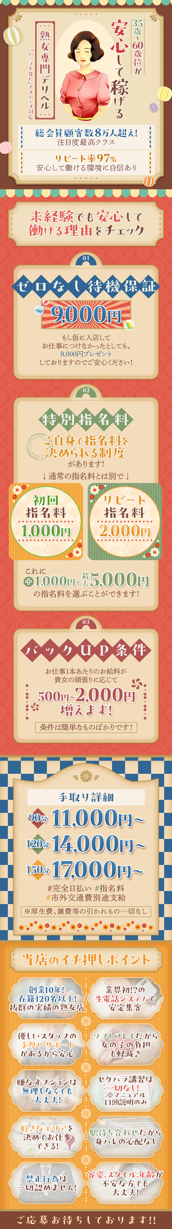 【待機保証キャンペーン】 6時間受付で・・・9,000円 ※初出勤から10日間 <通常手取> 90分: 11,000円~ 120分:14,000円~ 150分:17,000円~ 180分:20,000円~ ※雑費など一切引かれ物はありません。