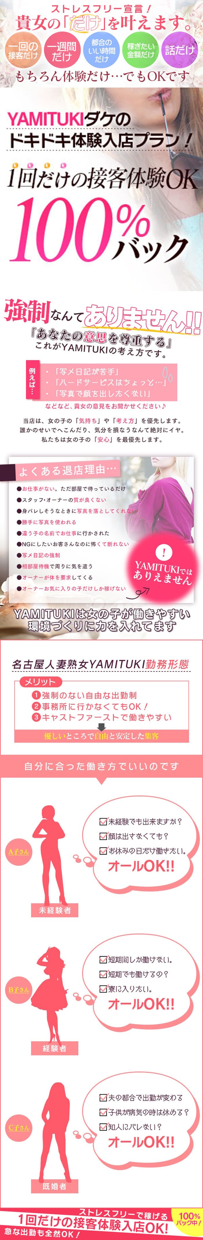 女の子のお仕事に対してノルマや罰金などがないお店だよ♪お店によっては、入店から◯ヶ月以降からはノルマが発生したり、無断欠勤などでは罰金になってしまうなどルールがあったりもするから、入店前にはしっかり聞いてみてね!