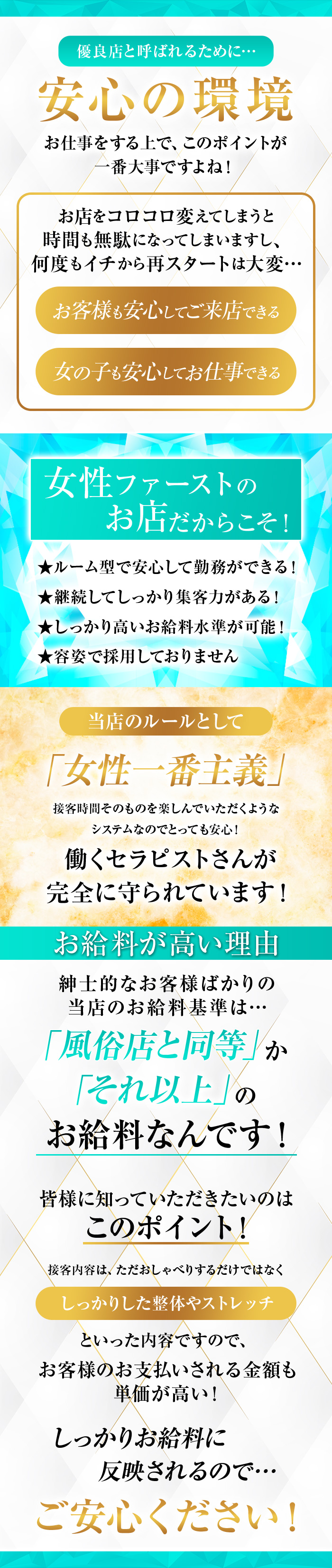 大手グループが経営しているお店だよ。待遇や条件も手厚くて安心だし、集客力もあって女の子が稼ぎやすい!待遇や条件はグループの中でも店舗ごとに変わってくるから、気になるポイントは問い合わせて聞いてみよう♪