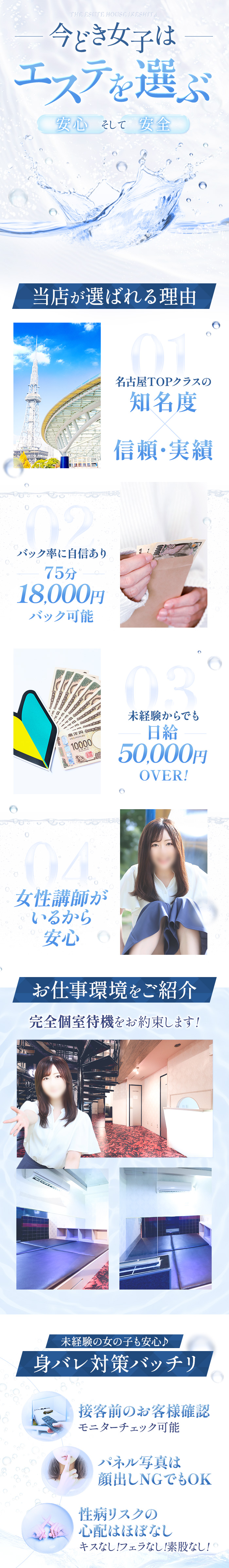 保証制度あり+風俗エステ店なのにヘルス以上の高収入を実現! THE ESUTE HOUSEは風俗エステというジャンルになりますので、 アロマオイルを使ったリラクゼーションマッサージ+ハンドサービスでお客様を癒すお仕事です! お客様は女性の上半身のみ触ることができますが、女性側は上半身ヌードまでとなっており、下半身を脱ぐことや触られることはありません!わかりやすいコンセプト店になりますので業界未経験が8割活躍中です♪ 50分 7000円~12000円+α 60分 9000円~14000円+α 75分 11000円~16000円+α 90分 13000円~18000円+α 120分 17000円~22000円+α 本指名 2000円 延長20分 3000円 コスプレ 500円 ゴムフェラ 3000円 破廉恥 3000円 OPセット① ゴムフェラ + 破廉恥 5000円
