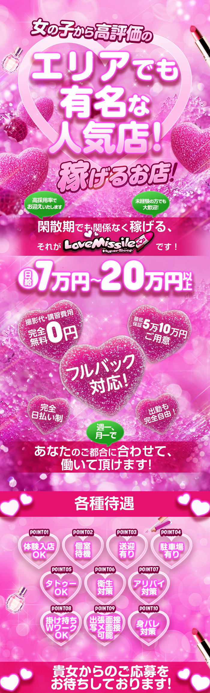 日給7万円~20万円以上稼ぐことが可能です! 日払い制ですので、その日にお給料をお渡しさせて頂きます♪