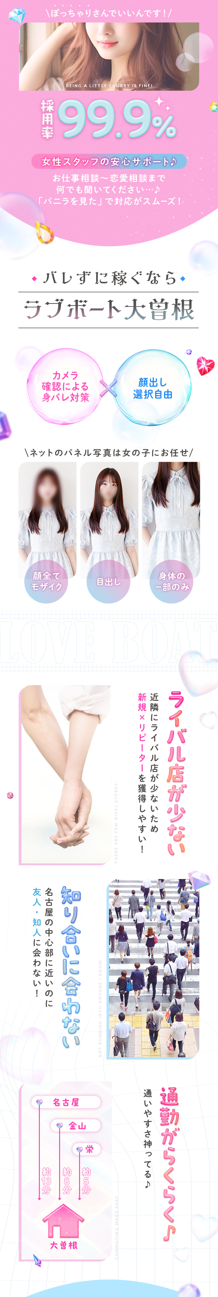 ラブボート新栄のココがオススメ!! ●即日面接・即日体験が大歓迎! ●未経験の方に面接交通費1万円円支給! ●完全送迎:近郊、遠方に関わらず県内・三重・岐阜まで送迎致します! ●自由出勤:空いた時間にちょっとだけ、がっつり出勤…etc.貴女にあった働き方でどうぞ! ●寮完備:オートロック付きマンションの寮あります! ●性病検査:提携病院にて、迅速に検査、病気に対応致します! 気になる事、ご質問ございましたら小さな事でも結構ですので 何なんりとお申しつけ、ご相談ください!(*'▽') また、上記の待遇以外でも、女の子の意見によって様々な待遇を検討致します。 遠慮せずに気軽にスタッフまでご意見下さいませ♪ ◇プライバシーの徹底として店内のお客様をモニタリング可能! もしかしたら知り合いかも……みたいな事があれば気にせず仰ってください! ◇本当に!女性スタッフも在籍しております! 男性スタッフに相談しにくい事がございましたら女性スタッフに……という選択肢もございますよ!