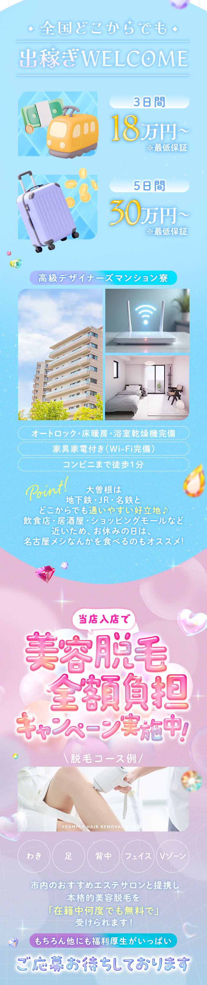 当店が存在するのは、働く女の子達の存在があってこそ。 未経験の女性からベテランの女の子、更には出稼ぎ、掛け持ちの女の子まで、全ての女性に平等に!! 満足のいく高収入と高待遇を提供しております。 ●即日面接・即日体験が可能です。 ●面接の際も名古屋市内でしたらお迎えが可能です。 ●時間を無駄にする「実技講習」は御座いません ●全女の子完全個室待機 ●完全送迎:近郊、遠方に関わらず県内・三重・岐阜まで送迎致します。 ●自由出勤:年中無休営業 ●寮完備:オートロック付きマンションの寮を完備 ●性病検査:提携病院にて、迅速に検査、病気に対応 他には生理休暇、自宅待機、短期・出稼ぎ歓迎 etc…。 女の子を第一に考えたからこその待遇が御座います。 また、上記の待遇以外でも、女の子の意見によって様々な待遇を検討致します。 遠慮せずに気軽にスタッフまでご意見下さいませ。 ※プライバシーの徹底:店内でモニタリング可能。 安心してお仕事をして頂くために、個人情報の管理やアリバイ対策に関しましては、グループ全店で徹底しておりますので、ご安心下さい。
