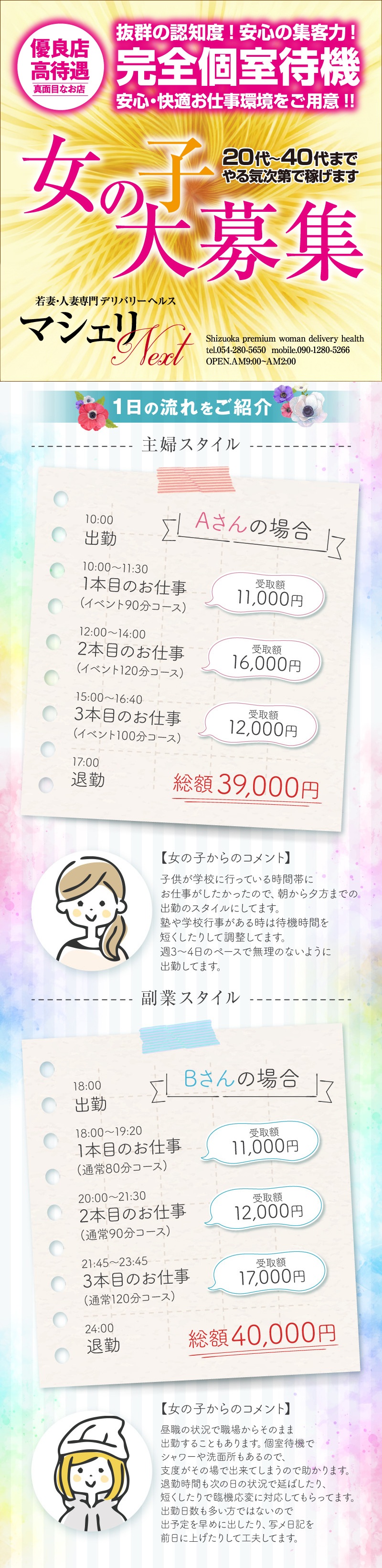 このお仕事の最大のメリットは自由と高収入。応募される女性の方の多くが考えていること。でもやっぱりそれなりにペナルティーとかあるんじゃないの・・・なんて思っている方もいらっしゃるのでは。とんでもありません。ノルマもなければ罰金もありません。・完全自由出勤(いつでも自由に出勤してください)急な子供の用事、急な家族の用事、昼職の関係で急に用事ができてしまうこはありますよね。当日欠勤も大丈夫。人妻店ならではの女の子の事情も十分理解しているつもりです。いつでもご相談ください。・出勤日数や時間、写メ日記のノルマありません出勤時間や待機時間もちろん完全自由です。皆さんのライフスタイルに合わせた働き方で大丈夫です。もちろん効率的な働き方などのご相談はどんどんしてください。写メ日記も自由です。お店から写メ日記を書くように注意することもありませんのでご安心ください。・備品も全てお店にご用意してあります。お仕事で使くローション、うがい薬、グリンスはお店でご用意しておりますので、ご自身で購入する必要はありません。(個人的に自分の使いたいという方はもちろん自由です)また、オプションのグッズも全てお店でご用意しております。備品代はいっさいかかりませんのでご安心ください。マシェリでは女の子お仕事環境を第一に考えてます!!!いっしょにマシェリで理想を叶えましょう!!