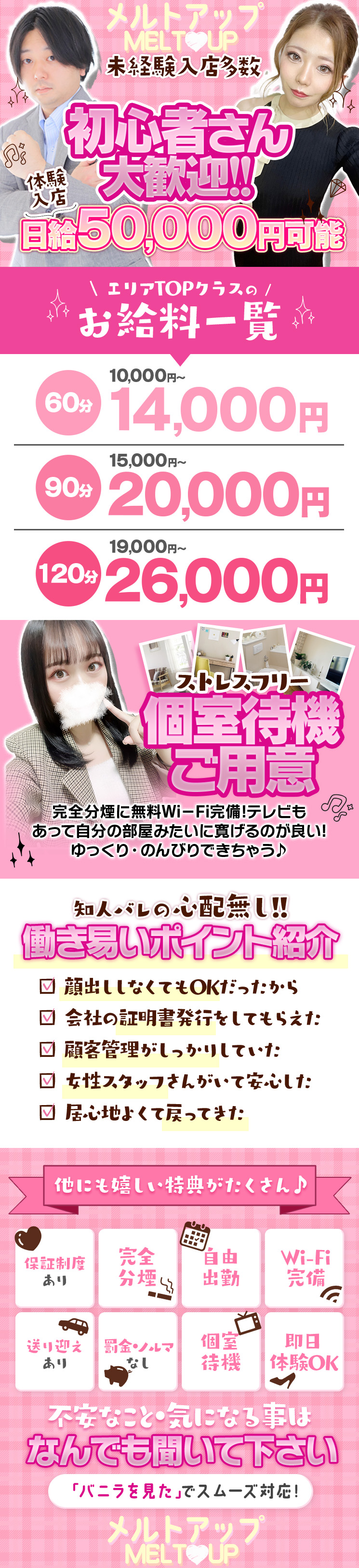 ☆体験入店5万円保証☆【ホントにでちゃいますっ!!】名古屋屈指の抜群の待遇で一緒に1番を目指しますしょう!!他店様で悩んでる方、なかなかお店を変えることが出来ない方一度お話だけでもさせてください🙇どんな些細なことでも相談にのります!!『どうすれば稼げるのか』『身バレ心配でどうしよう』『お仕事との両立が、、、』などなどMELT☆UP-メルト・アップ-ならすべて解決します!!面接時の説明から入店後のサポートまであなたに合わせた一番の理想形をともに考え、安心安全に長く働いてただけるよう環境を整えてお待ちしております🙇