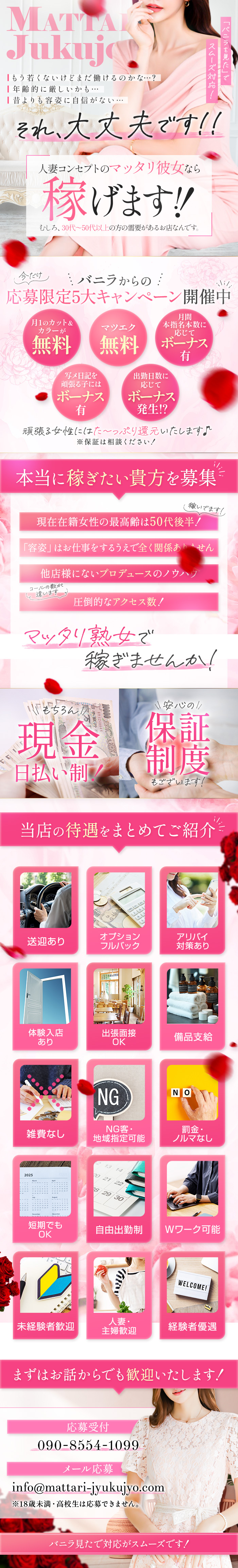 はじめまして!マッタリ熟女です! 当店では、体験入店してみて少しでも違うなと思われた場合は入店しなくても大丈夫ですよ! お店選びはとても大切ですので、まずは雰囲気だけ見てみたいなどのご要望にもお応えしています♪ お気軽にお問い合わせください!