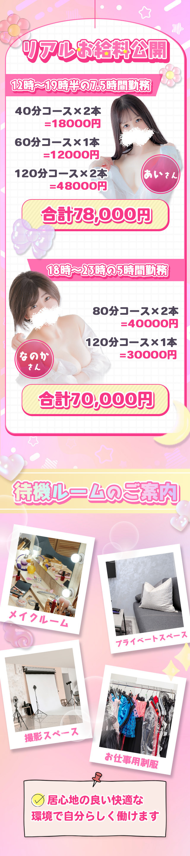 副業やWワークを歓迎しているお店だよ。時間が許す限りガンガン働いていお金を稼ぎたい女の子にはありがたいよね。シフトの入れ方にはお店ごとに決まりがあるから、詳しい条件は問い合わせてみよう♪