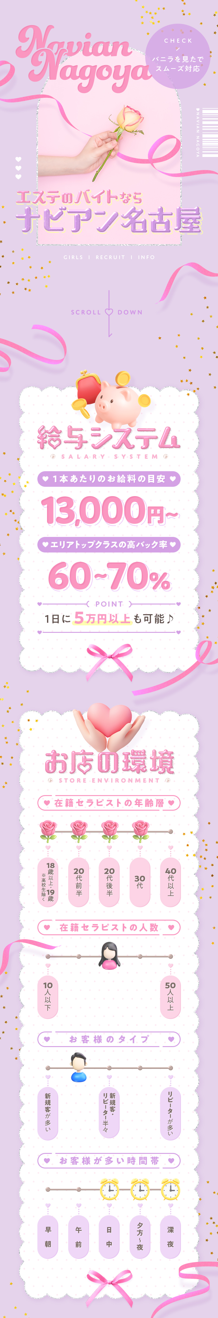 大手グループが経営しているお店だよ。待遇や条件も手厚くて安心だし、集客力もあって女の子が稼ぎやすい!待遇や条件はグループの中でも店舗ごとに変わってくるから、気になるポイントは問い合わせて聞いてみよう♪