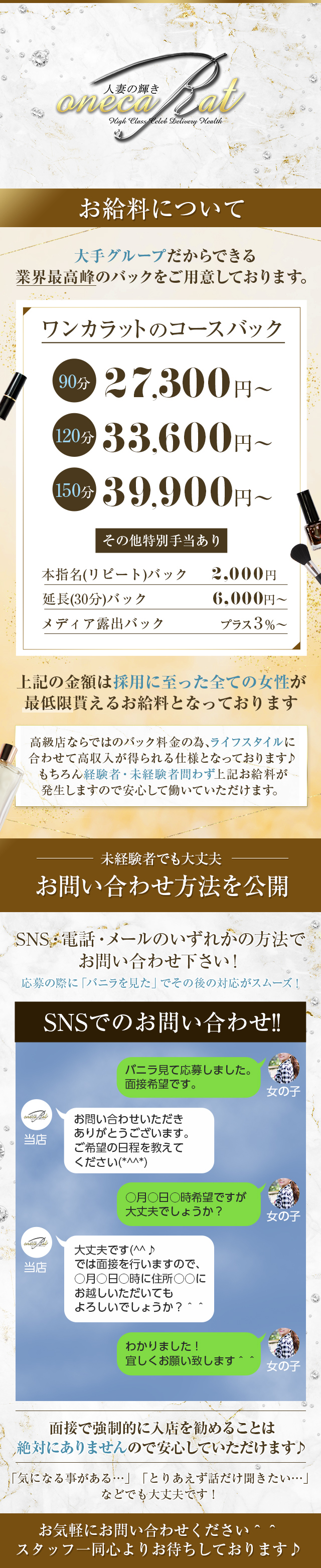いつも一生懸命に!とかもっと努力を!などいつも言われ続けると嫌になることがあります。でも、それは一生懸命を認めてくれない上司がいたり、努力が実らない環境にいるからという事も考えられます。『頑張っても、努力しても収入が上がらない!』そんな状態では、決して楽しく働くことは出来ません。私共、ワンカラットでは決してそのような事はございません。接客業の基本は、お客様を楽しませる事が最重要ですから、私たちが楽しく働いていなければ、出来るはずがありません。その為にはまず、お金が儲からないと、楽しくないはずです。90分のバック料金は15,000円~21,000円120分は19,500円~25,400円もちろん、本番行為などの違法サービスはなくハードなオプションも一切ございません。『こんな高くてお客様がいるの?』と思われた方、是非1日体験をしてみてください。沢山優しく、紳士な男性が、貴女をより高く評価する男性がたくさんいる事を知って頂けます。些細なご質問でも結構です、どうぞお気軽にメールまたはお電話にてお問い合わせください詳しい情報はオフィシャル求人サイトでご確認いただけます。