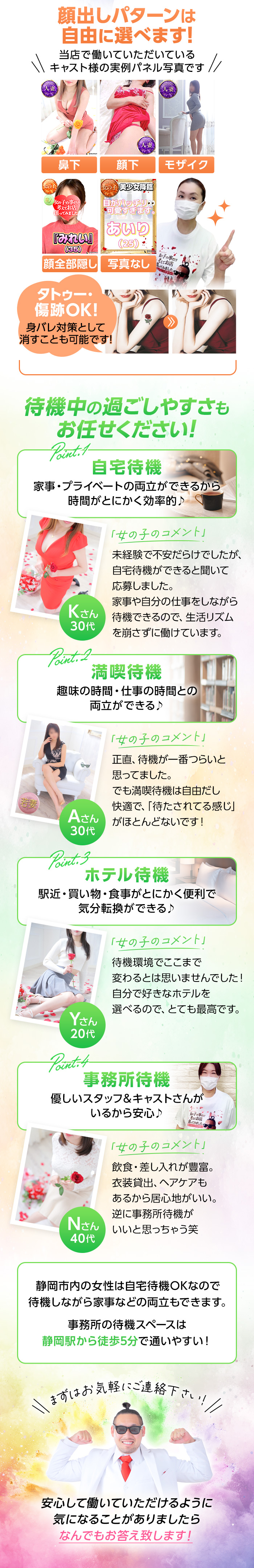うちは女性スッタフがおります。 話しやすさしかり待機所の清掃もしっかりしておりますので、 清潔感のある環境創りを徹底しております。