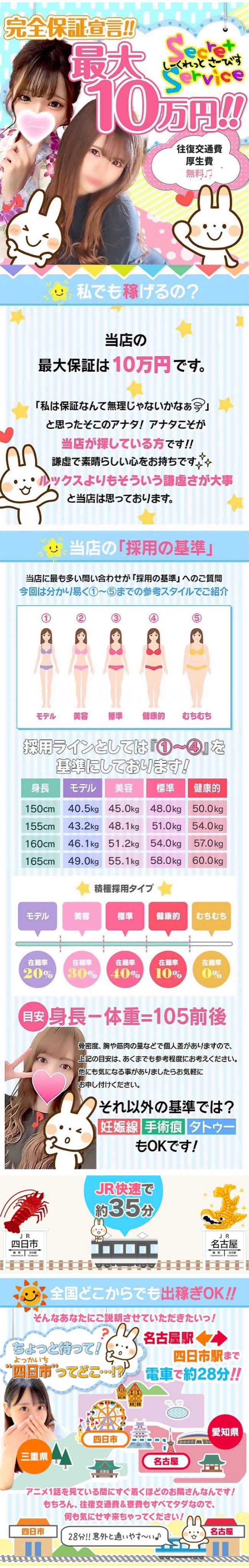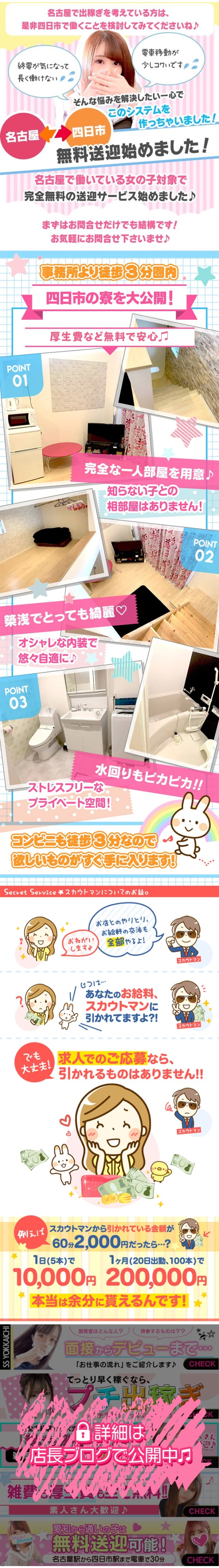 シークレットサービスの良さが丸分かり♪♪「女の子第一主義!!」女の子の事を第一に考え、女の子が働きやすい環境を一番に考えた取り組みを‘積極的‘に行なっている‘当店‘だからこそできる待遇です!