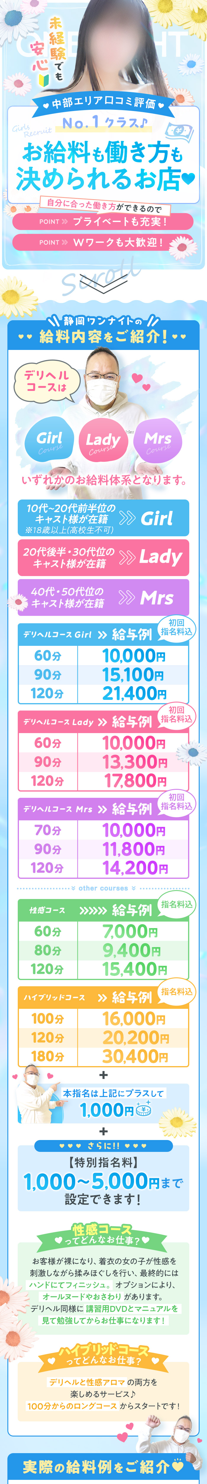 初めての方も、そうでない方もお店選びは緊張すると思います面談でリラックスしてお話しだけしてみませんか?例えば、、、・デリヘルって何?性感って何?ハイブリッドって何?・風俗で働いてみたいけど心配!・入店を前提とした面接はちょっと・・・・初めての風俗だから不安!・女性スタッフさんに話しを聞いて欲しい!・私の年齢で働けるのかしら?・経験者だけどこんな事が心配なんけど・・・と色々ありますよね面接なんて堅苦しい感じでは無く、面談でお話しだけしてみませんか?あなたの悩み事や不安に感じる事を静岡ワンナイトグループ責任者が全てお答え致します何でもお気軽にお問合せしてみて下さいお問合せ先LINEID:1-night電話番号:090-6098-2211▼バニラから入店した女の子へのインタビューもあります▼動画で実際のお給料を公開中▼スタッフへインタビュー動画でお店の雰囲気をチェック静岡ワンナイトグループ責任者高城悠二