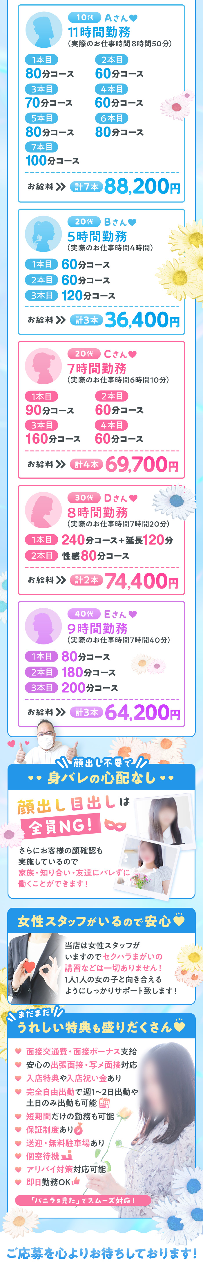 5万円以上目標 奨学金返済 入店歴 2ヶ月 勤務時間 5~8時間 月収 20万円以上 目標 脱毛と整形費用貯める。 入店歴 1ヶ月 勤務時間 6時間 月収 3.6万円以上 目標 貯金 入店歴 1年半 勤務時間 5時間 初日の給与 5時間勤務で