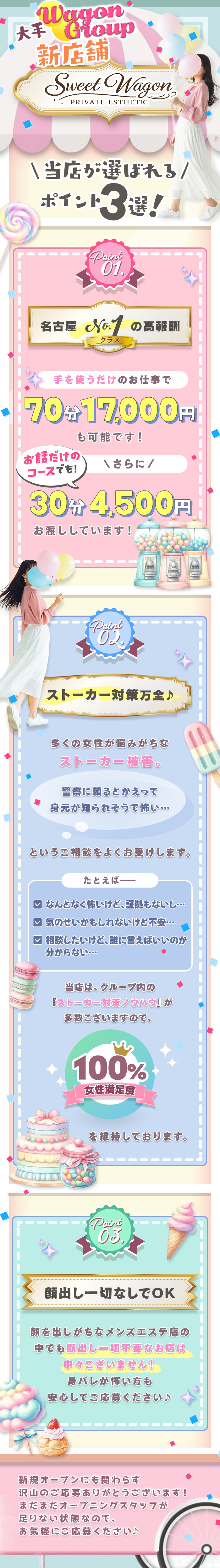 以前、系列店のワゴングループでお世話になっていました! 久々に復帰するので、こちらのスイートワゴンさんでお仕事させていただきます! 先日面接していただきましたが、店長さんがとてもいい方だったので、安心しました! よろしくお願いします!