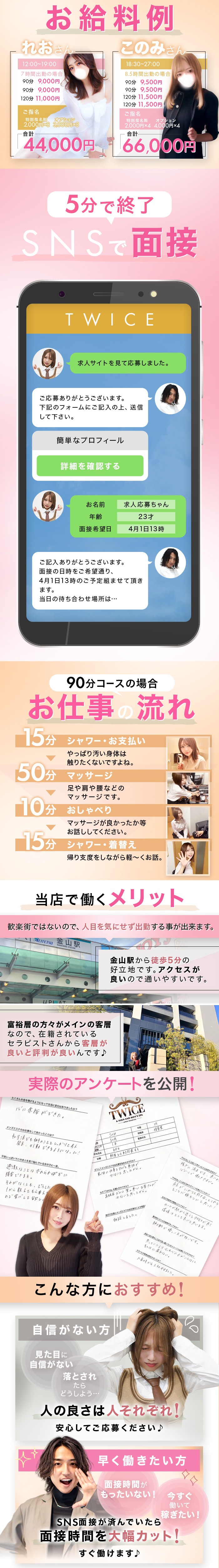 こんばんは、代表の杉村です!「モデルみたいに綺麗じゃないと稼げないんじゃ…」そう思って応募を迷っていませんか?実は、メンズエステで指名が絶えないセラピストには、共通点があります。それは「顔立ち」ではなく、次の2つです。① 究極の武器は「聞き上手」お客様が求めているのは、日常の疲れを忘れてリラックスすること。「お疲れ様です」「大変でしたね」と優しく話を聞ける方は、お客様にとって「また会いたい特別な存在」になります。② 「愛嬌」と「一生懸命さ」ドアを開けた時の笑顔や、「力加減はどうですか?」というちょっとした気遣い。そんな「一生懸命さ」に、お客様は一番癒やされます。【結論】自信がなくても大丈夫!「自分なんて…」と控えめな方ほど、一人ひとりのお客様を大切にできるので、実はこの仕事に向いています。メイクや接客のコツは、私が丁寧にお教えします。あなたの「人柄」を活かして、新しい一歩を踏み出してみませんか?まずはお気軽にお話ししましょう!