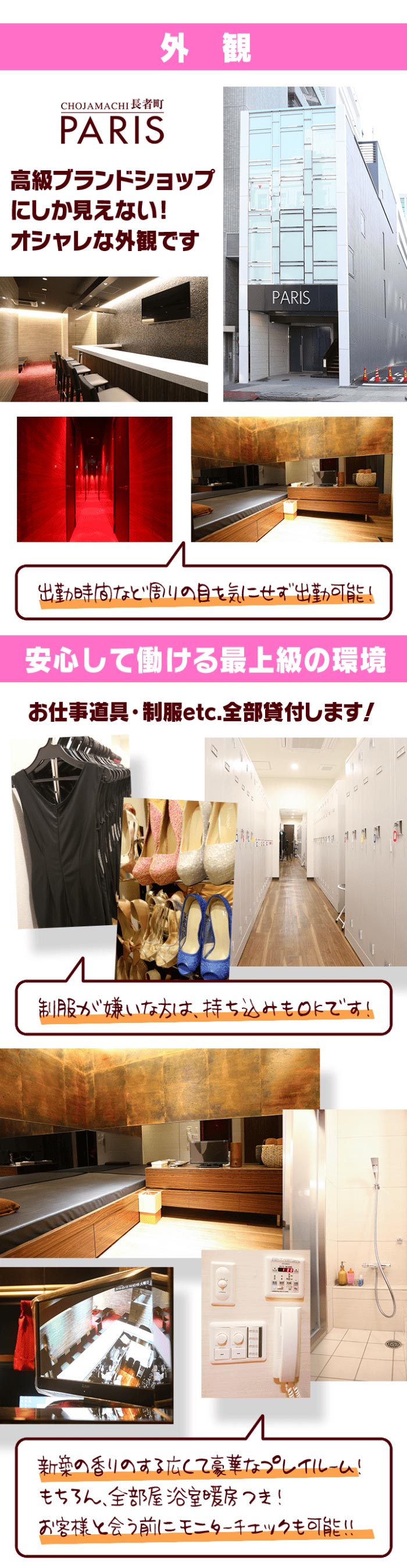 当店は共に働く女の子第一優先と考え、『働きやすい環境』『安心して働ける環境』『無理をせずに稼げる環境』『お客様も女の子も満足して頂ける環境』を目指しております!初めての風俗、経験のない女の子…経験はあるけど稼げるか不安でいっぱいな女の子…様々な思いがあると思いますが、まずは勇気を出して一度お気軽にお問合せ下さい!