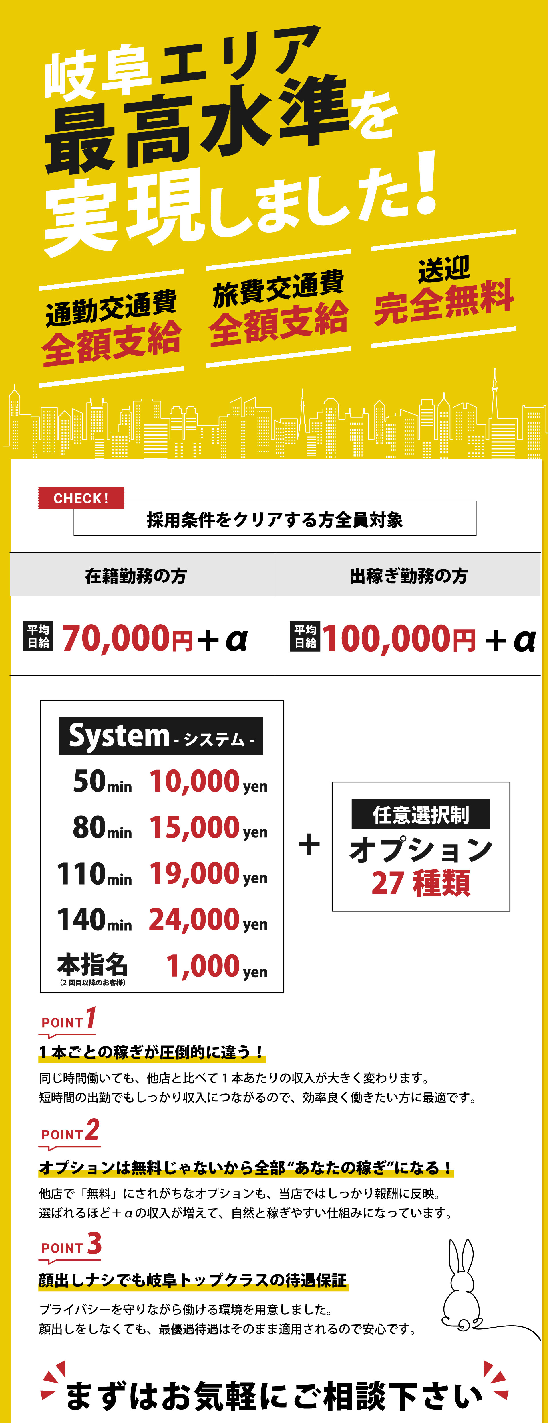 STEP.1 応募方法※18歳未満・高校生の方の応募は出来ません。◆LINEで応募◆「岐阜版バニラを見た」とお伝えいただければスムーズです。ご質問などあればお気軽にお伝えください。◆電話で応募◆TEL:090-5002-1678LINEと同様に「岐阜版バニラを見た」とお伝えください。◆バニラページ内でご応募◆ページ内の応募ボタンからもご応募可能です。STEP.2 面接場所≪事務所で面接≫お車の方は当店事務所近隣まで直接お越しください。公共交通機関の方はJR岐阜駅までお越しいただければお迎えに上がります。≪LINE面接≫LINEでの写メ面接も可能です。遠方の方や来店が難しい方も安心してご応募ください。STEP.3 面接≪即日体験≫も可能です。その際は下記書類のご準備をお願いします。①本籍地記載の住民票②顔写真付きの公的証明書(免許証・マイナンバーカード・パスポートなど)上記は法律で定められた必要書類です。必ずご用意ください。面接時間は概ね1時間程度です。気になる点や不安なことはお気軽にお話しくださいね。STEP.4 入店書類確認とご条件のご説明後、ご希望があれば当日体験入店も可能です。日を改めての入店も対応しておりますのでご安心ください。STEP.5 精算お仕事終了後、その日のうちに精算いたします。直近3ヵ月の体験初日平均は約4万円。待機時間や露出度によってはそれ以上も十分可能です。顔出しなしでもしっかり稼いでいる方も多数在籍しています。精算後はご希望の場所までお送りいたします。岐阜市内(事務所から半径5~6km圏内)であれば送迎無料。終電がなくなっても安心してご帰宅いただけます。ぜひ、当店の集客力とサポート体制をご実感ください。皆様からのご応募を心よりお待ちしております。