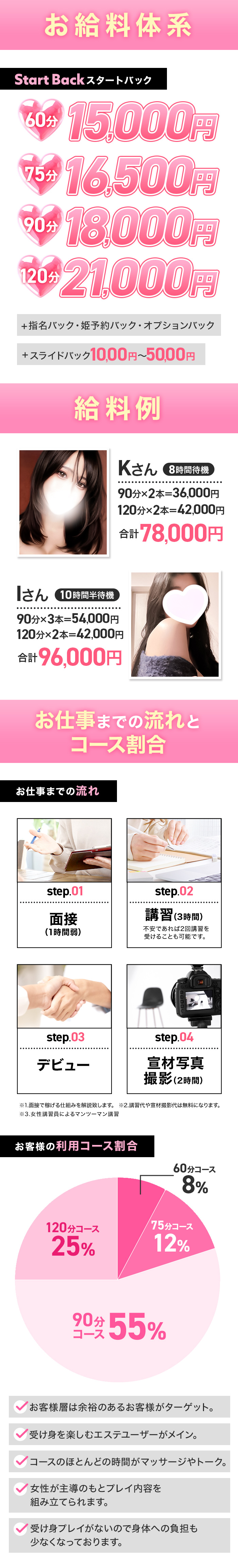 手を使うだけ・見ているだけ・または女の子が受け身にならなくてOKなソフトサービスメインのお店だよ♪初心者の女の子には始めやすいお仕事だね!コースによってサービスの違いがあるお店もあるみたいだから、お仕事内容は事前に聞いてみよう!