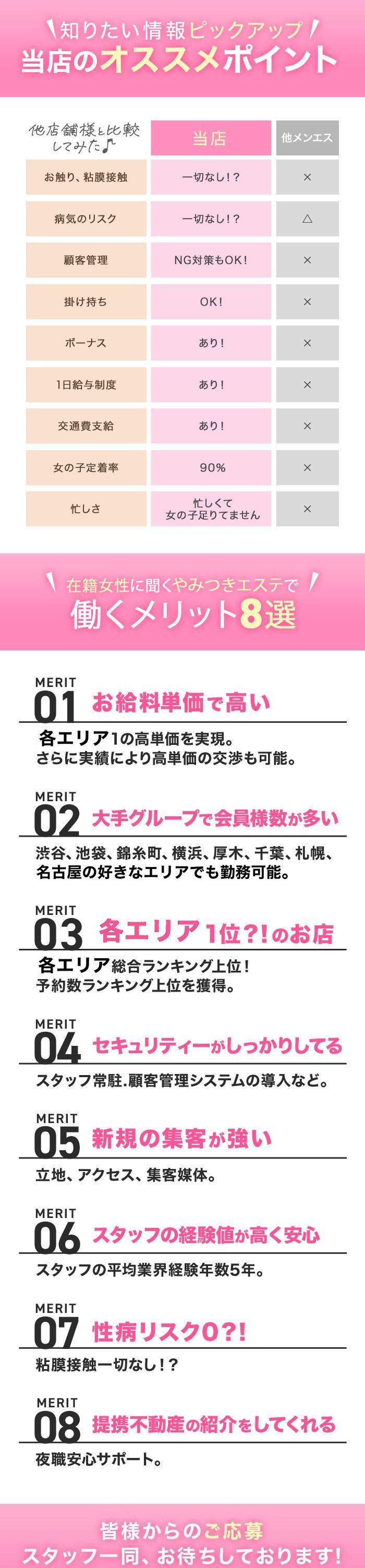 求人担当の山下です!やみつきエステの採用基準①求人担当山下『何でここで働きたいの?』Aさん『10万円稼ぎたいからです』求人担当山下『採用‼︎‼︎‼︎』②求人担当山下『今までエステの経験はありますか?』Aさん『エステ未経験だけど、やる気あります‼︎』求人担当山下『採用‼︎‼︎‼︎』未経験の方でも当店は講習がありますので安心してデビュー出来ます(^ ^)移籍の方は移籍金ボーナスも5万円渡しております。是非、お問い合わせお待ちしております‼︎